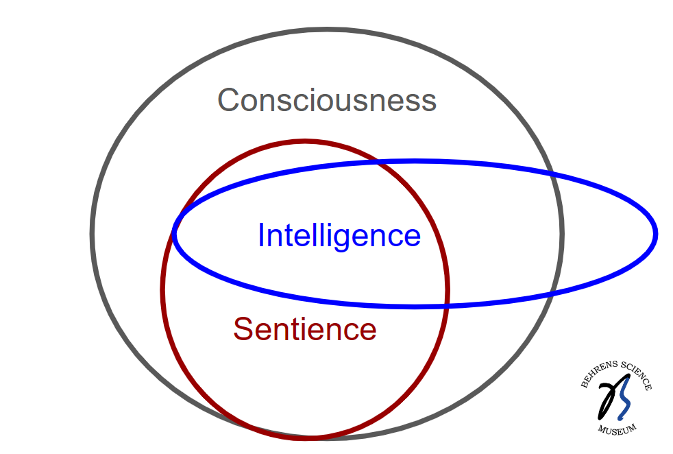 Note that ChatGPT brought up the idea of consciousness in asserting that it is not an AGI. Consciousness and sentience are closely related to intelligence. Sentience is the ability to feel things like pain and emotions. It is generally considered to be one aspect of the broader concept of consciousness. In principle, it is possible to be conscious without being sentient (think Data in Star Trek the Next Generation), but sentience suggests conscious experience (see the Venn diagram above). Consciousness also lies on a spectrum with “higher order” consciousness extending beyond wakefulness to include self-awareness and introspection.