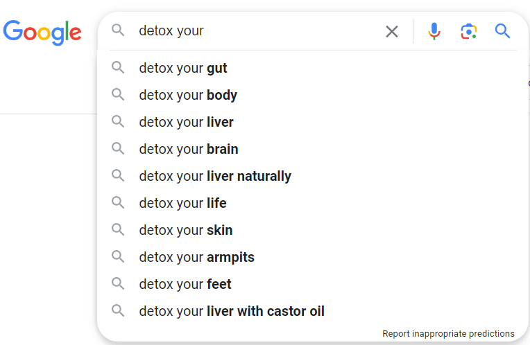 Take a look at the image below, where Google Autocomplete suggests phrases like “detox your liver,” “detox your gut,” and even “detox your armpits.” These suggestions reflect the pervasive use of the term “detox” in the wellness industry, almost all of which is BS.