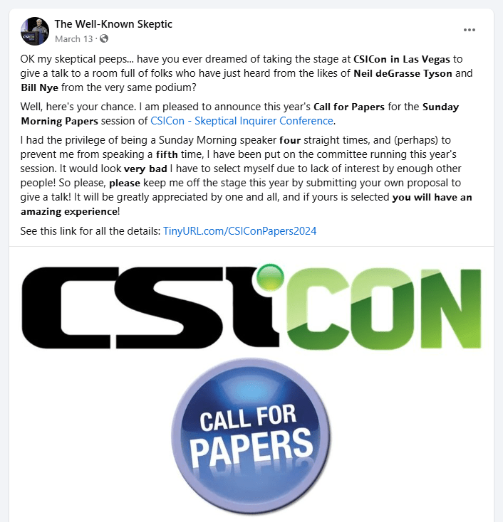 In March, The Well-Known Skeptic (Rob Palmer) announced the 2024 call for papers for the opportunity to speak at CSICon in October. See the announcement below. Obviously, this is a great opportunity to discuss the Behrens Science Museum concept, except for one problem…