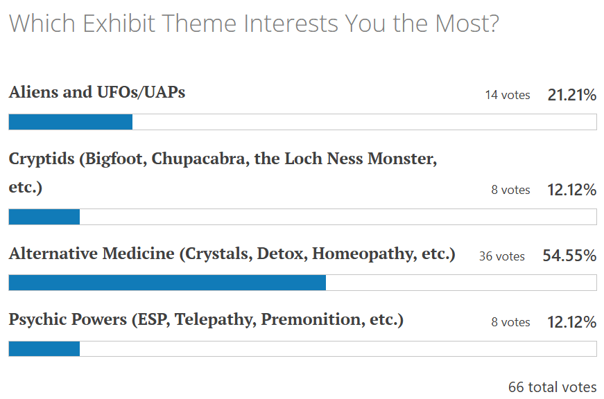 The most popular topic among the people who took our poll was alternative medicine. We couldn’t agree more given the current prominence of alternative medicine and anti-vaccine proponents at the highest levels of the US government. Thanks to everyone who participated!